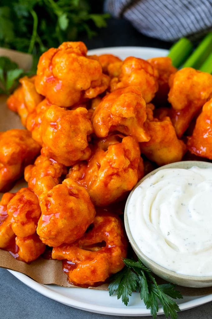 Fried cauliflower bites tossed in buffalo hot sauce and served with blue cheese dip